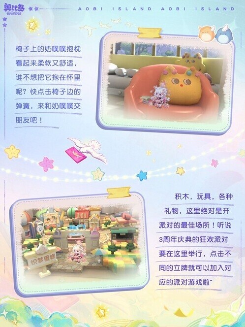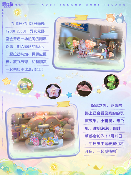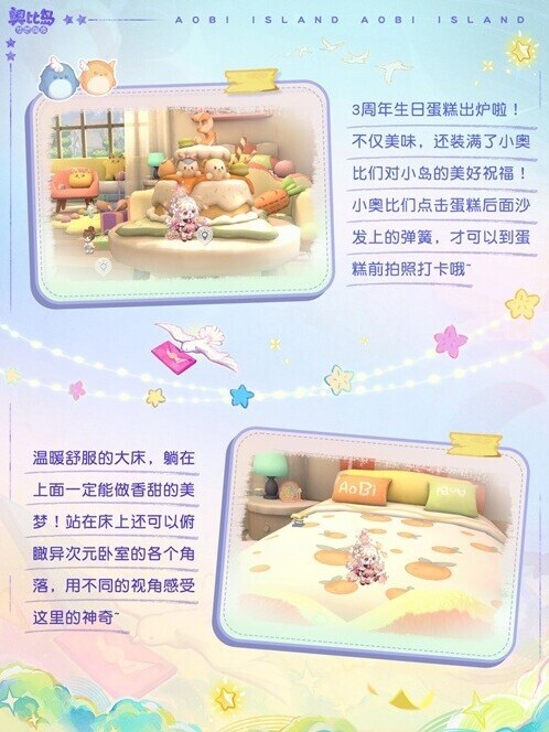 7月3日版本更新后,小奧比們可前往全新3d場景「異次元臥室」參加周年慶狂歡,在同款打卡點拍照留念!各個打卡點還有驚喜互動等著大家參與!